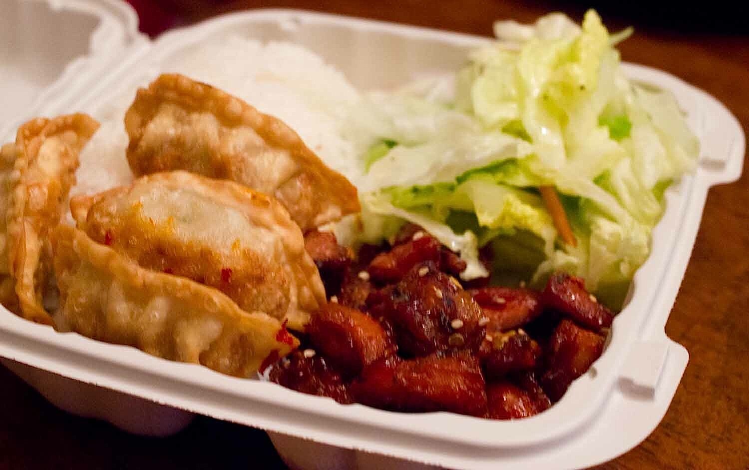 Teriyaki chicken stir-fried in hot sauce. Pho is ubiquitous around town and teriyaki that sticky-sweet Japanese. There also other places that serve Teriyaki.
